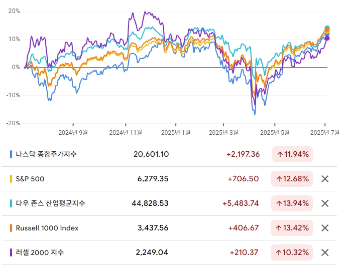 2분기 블루칩 지수인 다우존스는 위의 두 지수보다는 낮았지만, 5%의 양호한 상승률을 보였고, 특히 6월에만 4.3% 상승했다. 다우존스는 올해 들어 6월 30일까지 3.6% 상승하면서, 44,095 포인트로 상반기를 마쳤다.