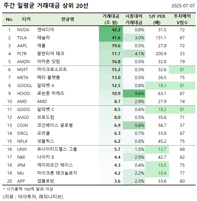 [美 주간탑] 엔비디아, 거래대금 42.2조원 1위.. 거래대금 상위 20선