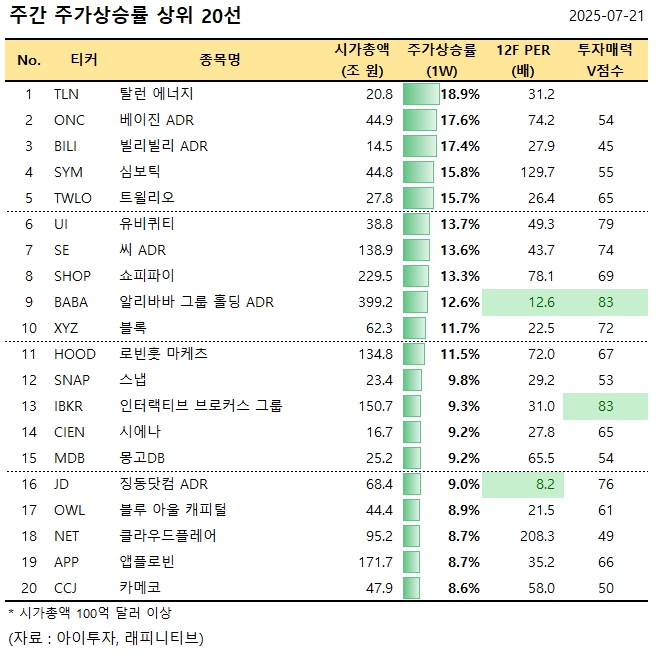 탈런 에너지(TLN), 베이진 ADR(ONC), 빌리빌리 ADR(BILI), 심보틱(SYM), 트윌리오(TWLO), 유비퀴티(UI), 씨 ADR(SE), 쇼피파이(SHOP), 알리바바 그룹 홀딩 ADR(BABA), 블록(XYZ), 로빈훗 마케츠(HOOD), 스냅(SNAP), 인터랙티브 브로커스 그룹(IBKR), 시에나(CIEN), 몽고DB(MDB), 징동닷컴 ADR(JD), 블루 아울 캐피털(OWL), 클라우드플레어(NET), 앱플로빈(APP), 카메코(CCJ)