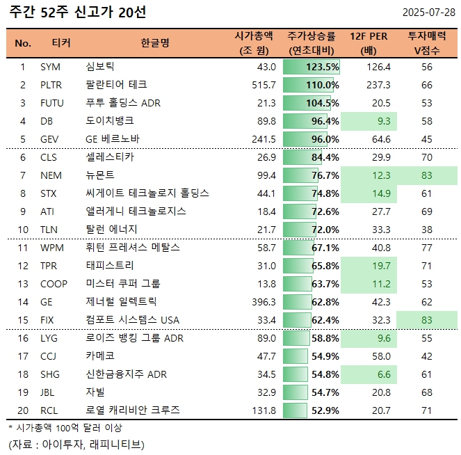 지난주 미국증시에서 52주 신고가를 기록한 종목은 심보틱(SYM), 팔란티어 테크(PLTR), 푸투 홀딩스 ADR(FUTU), 도이치뱅크(DB), GE 베르노바(GEV) 등 131종목(시가총액 100억 달러 이상)으로 집계됐다.