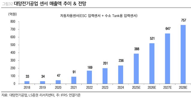 이 증권사 정홍식 연구원은 “자동차용 센서 매출액은 지난 2021년 91억원에서 2023년 201억원, 올해는 388억원으로 지난해 보다 64.5% 성장할 전망”이라며 “고객사인 M사의 글로벌 전기차용 ESC 센서 적용, 완성차 업체 공급 확대, 중국 로컬 업체로의 신규 공급 등이 진행되고 있기 때문”이라고 설명했다.