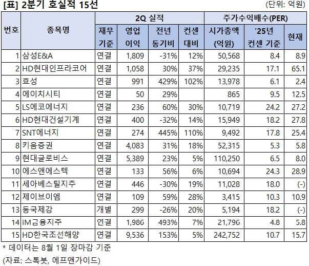 구체적으로 2분기 매출액과 영업이익이 모두 전년 동기 대비 두 자릿수 이상의 성장률을 기록했거나, 영업이익이 20% 이상 성장하거나 혹은 컨센서스(증권가 실적 추정치 평균)를 10% 이상 상회한 종목을 선별했습니다.