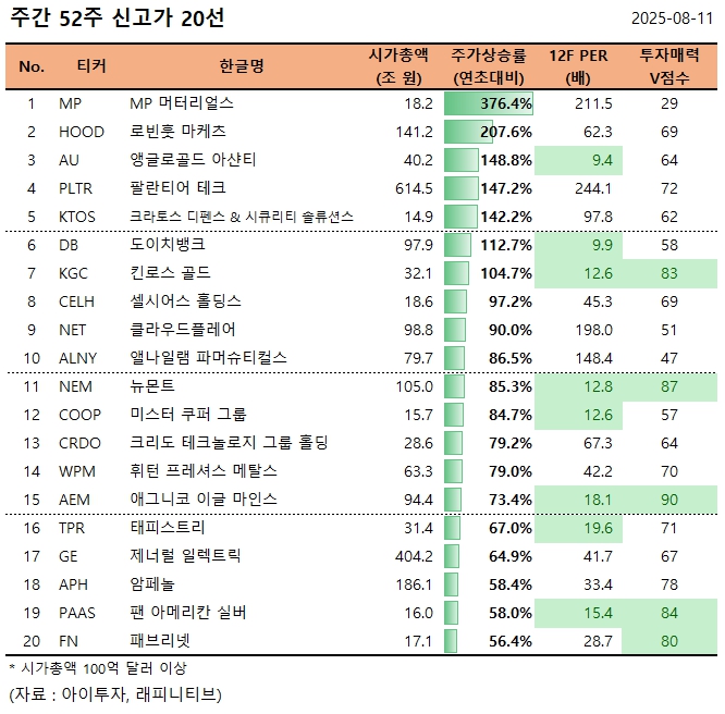 지난주 미국증시에서 52주 신고가를 기록한 종목은 MP 머터리얼스(MP), 로빈훗 마케츠(HOOD), 앵글로골드 아샨티(AU), 팔란티어 테크(PLTR), 크라토스 디펜스 & 시큐리티 솔류션스(KTOS) 등 84종목(시가총액 100억 달러 이상)으로 집계됐다.