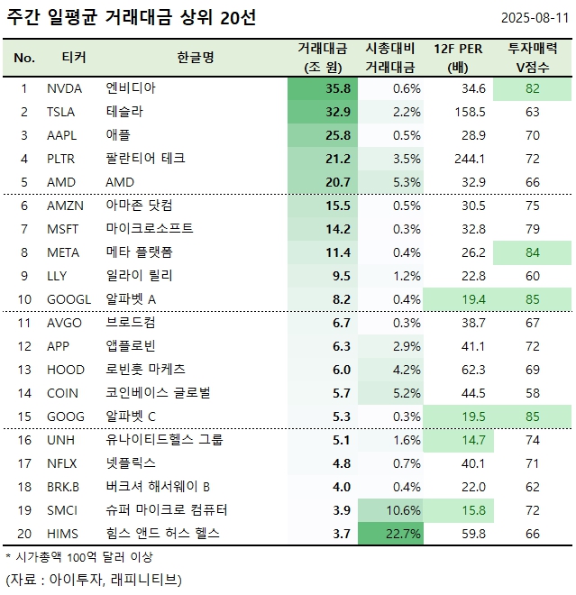 [美 주간탑] 엔비디아, 거래대금 35.8조원 1위.. 거래대금 상위 20선