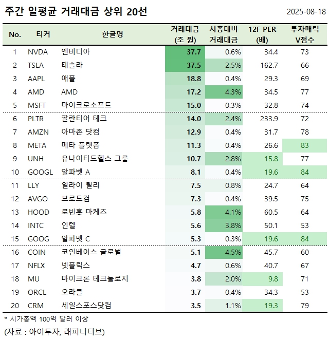 [美 주간탑] 엔비디아, 거래대금 37.7조원 1위.. 거래대금 상위 20선