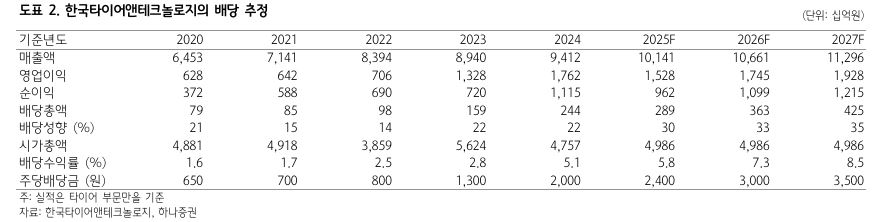 송 연구원은 “한국타이어앤테크놀로지의 타이어 부문만의 배당성향과 주당 배당금은 2024년 기준으로 22%와 2000원이었다”며 “배당성향이 올해 25%, 내년 30%, 2027년 35%로 확대되면, 주당 배당금은 2025년 2400원, 2026년 3000원, 2027년 3500원으로 늘어날 전망”이라고 했다.