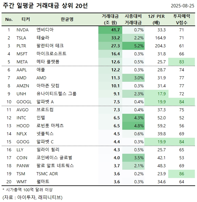 [美 주간탑] 엔비디아, 거래대금 41.7조원 1위.. 거래대금 상위 20선
