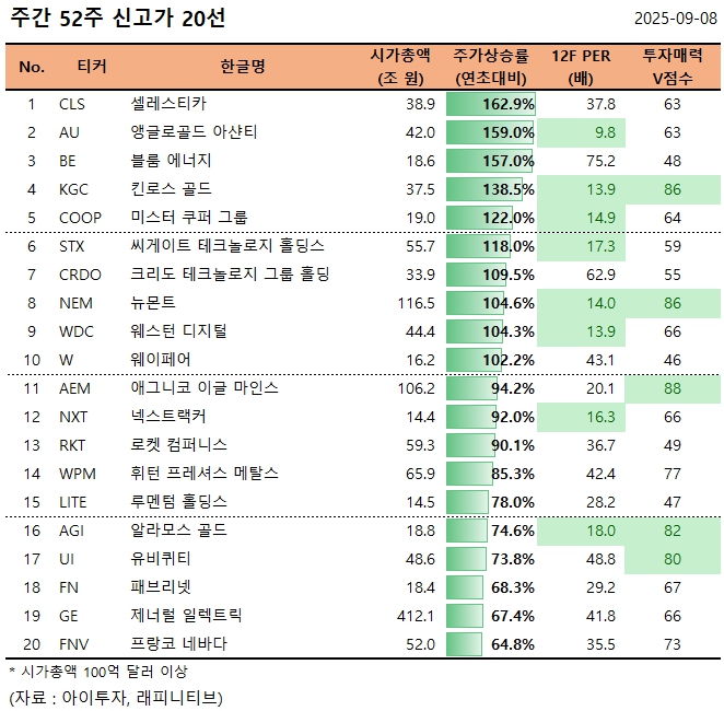 신고가 상위 기업 중 12개월 선행 PER이 20배 이하인 종목은 앵글로골드 아샨티(AU), 킨로스 골드(KGC), 미스터 쿠퍼 그룹(COOP), 씨게이트 테크놀로지 홀딩스(STX) 등 8개로 집계됐다.