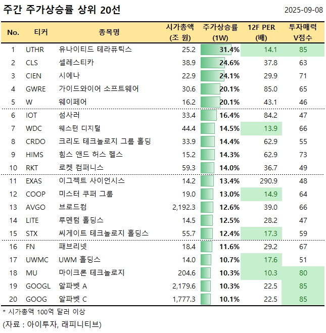 주가상승률 상위 종목 가운데 투자매력 V점수가 80점 이상인 종목은 유나이티드 테라퓨틱스(UTHR), 마이크론 테크놀로지(MU), 알파벳 A(GOOGL), 알파벳 C(GOOG) 등 4개다.