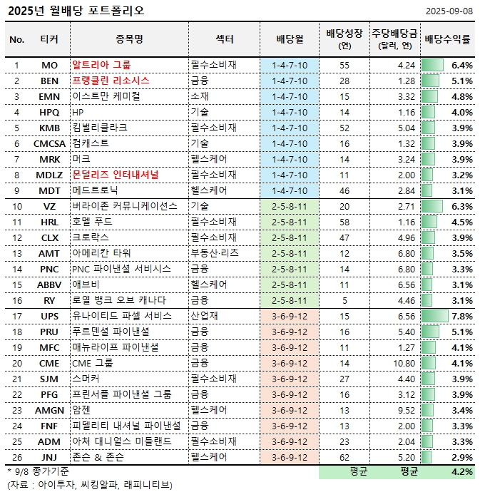 10월에 배당을 지급하는 대표 배당주로는 알트리아 그룹(MO), 프랭클린 리소시스(BEN), 몬덜리즈 인터내셔널(MDLZ) 등 3개 종목이 선정되었습니다.