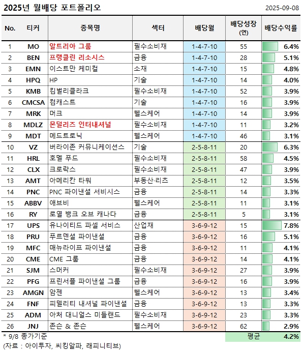 10월에 배당을 지급하는 대표 배당주로는 알트리아 그룹(MO), 프랭클린 리소시스(BEN), 몬덜리즈 인터내셔널(MDLZ) 등 3개 종목이 선정되었습니다.
