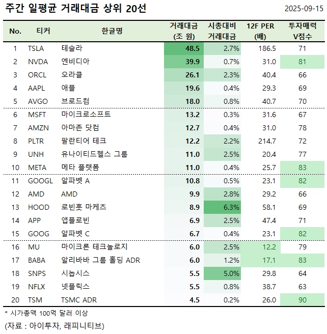 이 밖에 엔비디아(NVDA), 오라클(ORCL), 애플(AAPL), 브로드컴(AVGO) 등도 거래대금이 많았다.