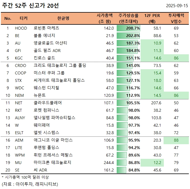 지난주 미국증시에서 52주 신고가를 기록한 종목은 로빈훗 마케츠(HOOD), 블룸 에너지(BE), 앵글로골드 아샨티(AU), 골드 필즈 ADR(GFI), 킨로스 골드(KGC) 등 141종목(시가총액 100억 달러 이상)으로 집계됐다.