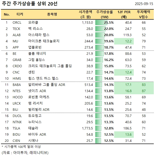 오라클(ORCL), 텍 리소스(TECK), 아스테라 랩스(ALAB), 마이크론 테크놀로지(MU), 앱플로빈(APP), 블룸 에너지(BE), 그랩 홀딩스(GRAB), 크리도 테크놀로지 그룹 홀딩(CRDO), 센틴(CNC), 힘스 앤드 허스 헬스(HIMS), 알리바바 그룹 홀딩 ADR(BABA), 넷이즈 ADR(NTES), 로빈훗 마케츠(HOOD), 램 리서치(LRCX), 빌리빌리 ADR(BILI), 듀오링고(DUOL), 누타닉스(NTNX), 테슬라(TSLA), 바이두 ADR(BIDU), 시에나(CIEN)