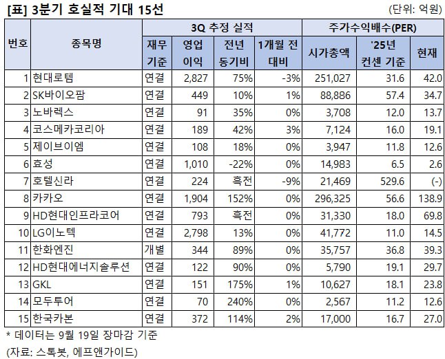 이러한 점들을 고려해 이번 스톡봇 레터는 3분기 호실적 기대주를 찾아봤는데요. 구체적으로는 증권가 컨센서스(3개월 추정치 평균)를 바탕으로 영업이익이 전년 동기 대비 증가할 것으로 기대되거나, 한 달 전에 비해 상향된 종목을 선별했습니다.