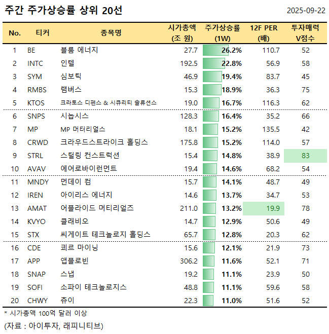 블룸 에너지(BE), 인텔(INTC), 심보틱(SYM), 램버스(RMBS), 크라토스 디펜스 & 시큐리티 솔류션스(KTOS), 시놉시스(SNPS), MP 머터리얼스(MP), 크라우드스트라이크 홀딩스(CRWD), 스털링 컨스트럭션(STRL), 에어로바이런먼트(AVAV), 먼데이 컴(MNDY), 아이리스 에너지(IREN), 어플라이드 머티리얼즈(AMAT), 클래비오(KVYO), 씨게이트 테크놀로지 홀딩스(STX), 쾨르 마이닝(CDE), 앱플로빈(APP), 스냅(SNAP), 소파이 테크놀로지스(SOFI), 츄이(CHWY)