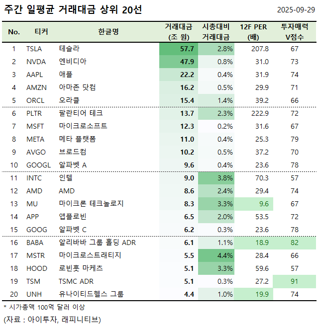 테슬라(TSLA), 엔비디아(NVDA), 애플(AAPL), 아마존 닷컴(AMZN), 오라클(ORCL), 팔란티어 테크(PLTR), 마이크로소프트(MSFT), 메타 플랫폼(META), 브로드컴(AVGO), 알파벳 A(GOOGL), 인텔(INTC), AMD(AMD), 마이크론 테크놀로지(MU), 앱플로빈(APP), 알파벳 C(GOOG), 알리바바 그룹 홀딩 ADR(BABA), 마이크로스트래티지(MSTR), 로빈훗 마케츠(HOOD), TSMC ADR(TSM), 유나이티드헬스 그룹(UNH)