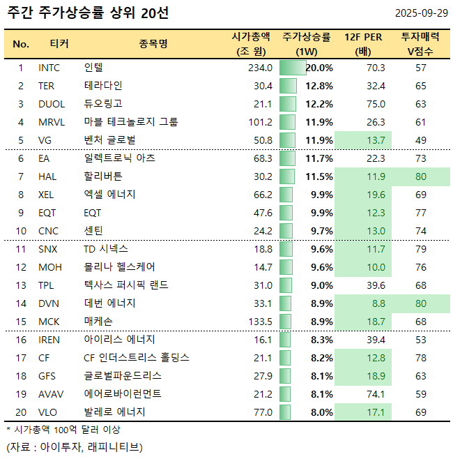 지난주 미국증시에서 가장 높은 주가상승률을 기록한 종목은 인텔(INTC)로 한 주간 20% 상승했다(시가총액 100억 달러 이상). 투자매력 V점수는 57점을 기록했다.