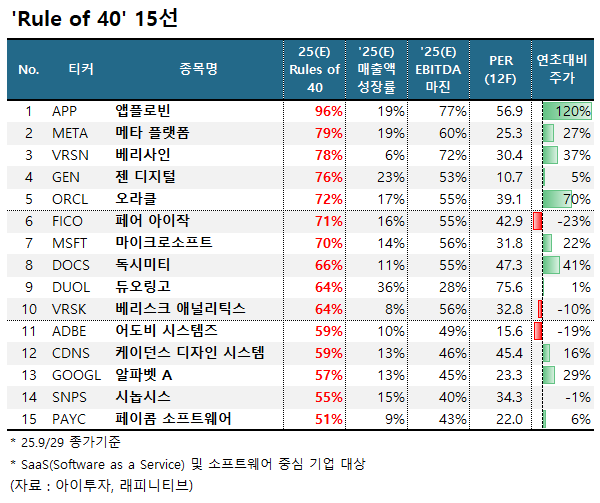 ▶ 'Rule of 40' 15선 : 앱플로빈(APP), 메타 플랫폼(META), 베리사인(VRSN), 젠 디지털(GEN), 오라클(ORCL), 페어 아이작(FICO), 마이크로소프트(MSFT), 독시미티(DOCS), 듀오링고(DUOL), 베리스크 애널리틱스(VRSK), 어도비 시스템즈(ADBE), 케이던스 디자인 시스템(CDNS), 알파벳 A(GOOGL), 시놉시스(SNPS), 페이콤 소프트웨어(PAYC)