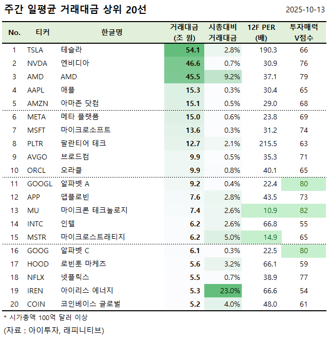 이 밖에 엔비디아(NVDA), AMD(AMD), 애플(AAPL), 아마존 닷컴(AMZN) 등도 거래대금이 많았다.
