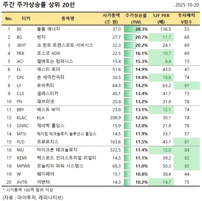 [美 주간탑] 블룸 에너지, 주가 28.3%↑... 주가상승률 상위 20선