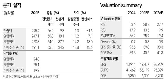 HD현대일렉트릭의 3분기 영업이익은 전분기 대비 18% 늘면서 시장 기대치를 7% 상회했다. 이 증권사 한영수 연구원은 “이번 분기 약 100억원의 관세 비용이 반영됐음에도 영업이익률은 분기 사상 최고 수준인 24.8%를 기록했다”며 “신규 수주도 전분기 대비 22% 증가해 전반적으로 양호한 실적을 거뒀다”고 설명했다.