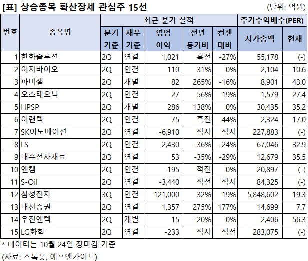 이에 따르면 한화솔루션27,800원, ▼-150원, -0.54%, 이지바이오6,320원, ▼-70원, -1.1%, 파미셀17,060원, ▼-190원, -1.1%, 오스테오닉6,410원, ▲50원, 0.79%, HPSP30,350원, ▼-650원, -2.1%, 이랜텍9,550원, ▲90원, 0.95%, SK이노베이션112,600원, ▼-3,300원, -2.85%, LS187,000원, ▲6,800원, 3.77%, 대주전자재료74,700원, ▼-1,300원, -1.71%, 엔켐71,500원, ▼-2,100원, -2.85%, S-Oil81,400원, ▲500원, 0.62%, 삼성전자105,100원, ▲600원, 0.57%, 대신증권28,000원, ▼-200원, -0.71%, 우진엔텍21,100원, ▼-300원, -1.4%, LG화학376,000원, ▼-4,000원, -1.05% 등이 리스트에 들었습니다.
