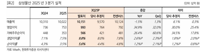 삼성물산의 3분기 연결기준 매출액은 전년동기 대비 1.5% 감소한 10조200억원, 영업이익은 같은 기간 34.9% 증가한 9934억원을 기록했다.