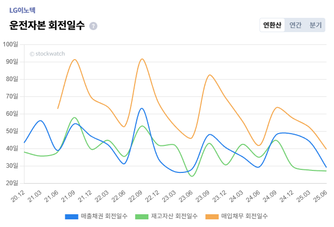 4. 효율성: 2분기 연환산 운전자본 회전일수는 '22년 이후 30~50일 사이에 있다. 매출채권 회전일수의 주기성과 고객사의 신제품 출하 일정 등을 통해 업황을 유추해 볼 수 있다.