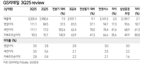 3분기는 민생지원 소비쿠폰 효과와 소비 심리 개선으로 편의점 매출 회복을 시현했다. GS리테일 3분기 연결 기준 매출은 전년 동기 대비 9.1% 늘어난 3조2000억원, 영업이익은 같은 기간 37.1% 증가한 1111억원으로, 영업이익 시장 전망치(컨센서스)를 17% 상회했다.