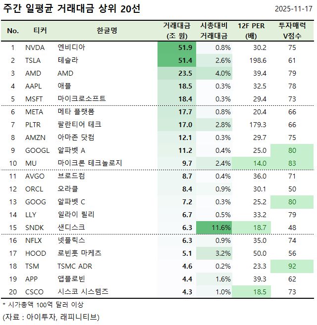 [美 주간탑] 엔비디아, 거래대금 51.9조원 1위... 거래대금 상위 20선