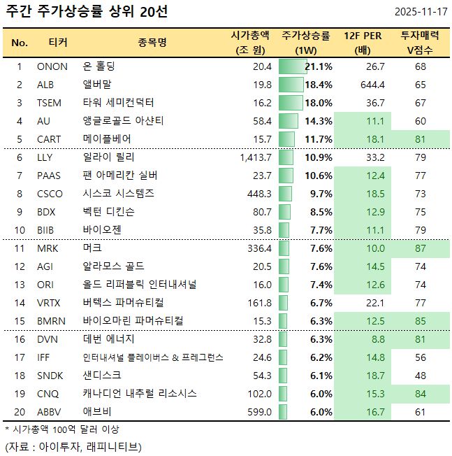 지난주 미국증시에서 가장 높은 주가상승률을 기록한 종목은 온 홀딩(ONON)으로 한 주간 21.1% 상승했다(시가총액 100억 달러 이상). 투자매력 V점수는 68점을 기록했다.