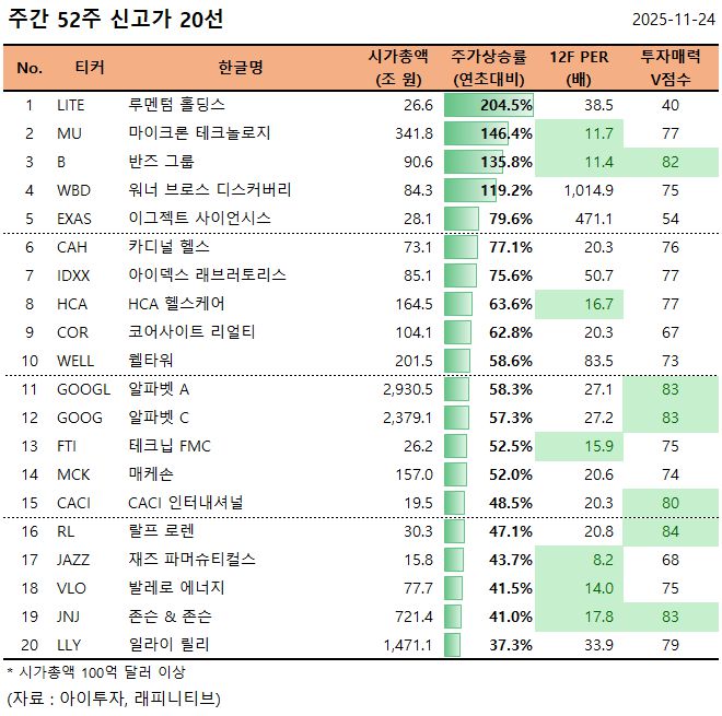 지난주 미국증시에서 52주 신고가를 기록한 종목은 루멘텀 홀딩스(LITE), 마이크론 테크놀로지(MU), 반즈 그룹(B), 워너 브로스 디스커버리(WBD), 이그젝트 사이언시스(EXAS) 등 58종목(시가총액 100억 달러 이상)으로 집계됐다.