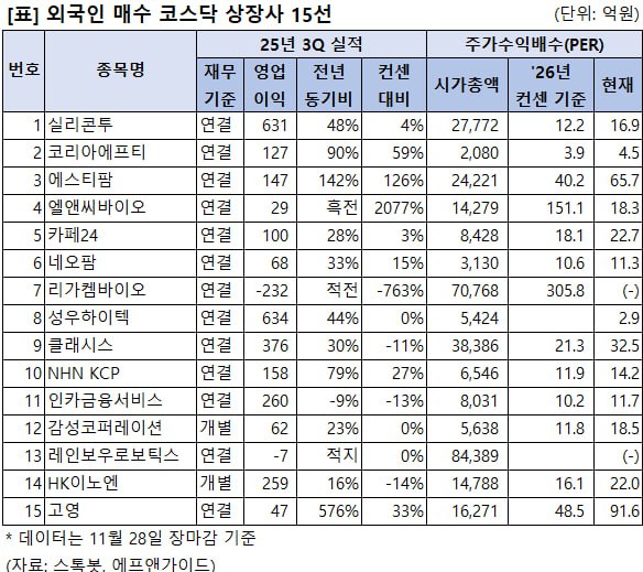 이에 따르면 실리콘투41,850원, ▼-800원, -1.88%, 코리아에프티8,390원, ▼-140원, -1.64%, 에스티팜118,000원, ▲100원, 0.08%, 엘앤씨바이오68,800원, ▲3,300원, 5.04%, 카페2434,450원, ▼-650원, -1.85%, 네오팜19,450원, ▼-250원, -1.27%, 리가켐바이오185,500원, ▼-10,600원, -5.41%, 성우하이텍7,330원, ▲110원, 1.52%, 클래시스55,300원, ▲200원, 0.36%, NHN KCP15,670원, ▼-160원, -1.01%, 인카금융서비스16,000원, ▲900원, 5.96%, 감성코퍼레이션6,670원, ▲10원, 0.15%, 레인보우로보틱스438,500원, ▼-34,000원, -7.2%, HK이노엔51,600원, ▼-1,000원, -1.9%, 고영26,950원, ▼-1,100원, -3.92% 등이 리스트에 들었습니다.