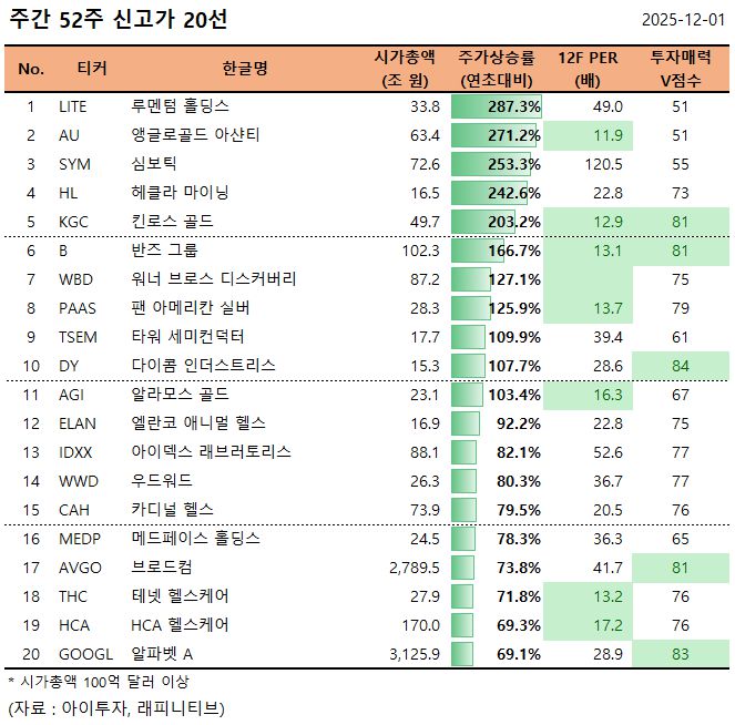 지난주 미국증시에서 52주 신고가를 기록한 종목은 루멘텀 홀딩스(LITE), 앵글로골드 아샨티(AU), 심보틱(SYM), 헤클라 마이닝(HL), 킨로스 골드(KGC) 등 115종목(시가총액 100억 달러 이상)으로 집계됐다.