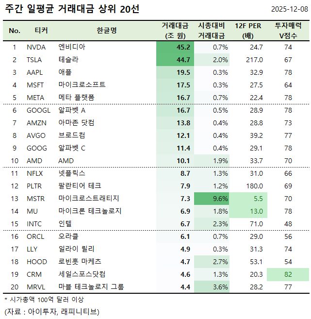 최근 5거래일간 미국증시에서 가장 많은 금액이 거래된 종목은 엔비디아(NVDA)로 하루 평균 45.2조원이 거래됐다. 시가총액 대비 거래대금 비중은 0.6%다.