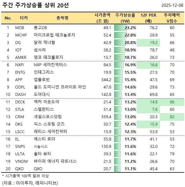 [美 주간탑] 몽고DB, 주가 23.2%↑... 주가상승률 상위 20선
