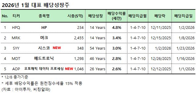 2026년 1월에 배당을 지급하는 대표 배당성장주로는 HP(HPQ), 머크(MRK), 시스코(SYY), 메드트로닉(MDT), 오토매틱 데이터 프로세싱(ADP) ​5개 종목이 선정되었습니다.