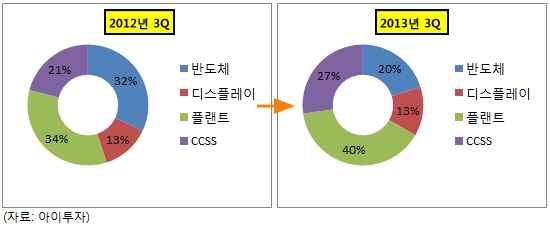 한양이엔지의 산업군별 매출을 보면 2013년 3분기 CCSS 매출비중은 전년 동기 21%에서 27%로 증가했다. 고마진 사업부의 매출 비중이 증가하면 기업의 실적도 개선된다. 반도체 매출비중은 감소했으나, 일반 플랜트 수주 매출이 증가했다.
