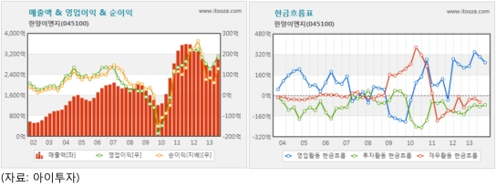 한양이엔지의 3분기 매출액은 868억원으로 전년 동기 대비 41% 증가했다. 영업이익도 65억원으로 전년 동기 26억원 대비 150% 성장했다. 현금흐름도 영업활동 현금흐름 (+), 투자활동과 재무활동 현금흐름이 (-)를 기록해 이상적인 현금흐름 구조다. 한양이엔지21,150원, ▼-350원, -1.63%는 영업보안을 이유로 수주잔고를 공시하지 않고 있다. 다만 경쟁사인 에스티아이30,000원, ▼-1,050원, -3.38%는 2013년 3분기 기준 수주잔고가 256억원이라고 공시했다.