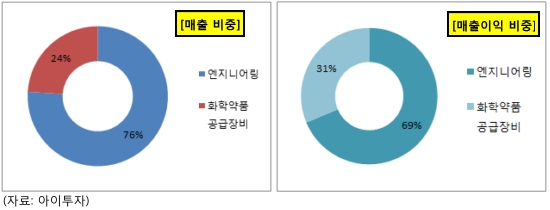 한양이엔지의 총매출의 76%는 엔지니어링에서 발생한다, 나머지 24%는 장비 사업이다. 엔지니어링부문은 반도체/디스플레이 공장에 초고순도 특수 유틸리티 설비를 공급한다. 장치부문은 화학약품중앙공급장치(Central Chemical Supply System, CCSS)를 제조 설치하고 유지 보수한다. CCSS는 반도체 및 디스플레이의 정밀화학 공정에 필수적인 화학약품을 생산장비에 공급한다. 한양이엔지는 CCSS 시장 40%를 점유해 경쟁사인 에스티아이30,000원, ▼-1,050원, -3.38%와 40%씩 시장을 양분하고 있다.