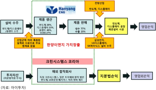 기업이 원재료를 구입하고 제품을 만들어 판매하는 과정을 보면 전·방 산업 및 실적에 영향을 주는 요소들을 파악할 수 있다. 한양이엔지는 수주 사업으로 주요 원재료 및 생산설비가 없다. 전방산업인 반도체와 디스플레이 산업의 설비투자에 실적이 좌우된다.