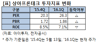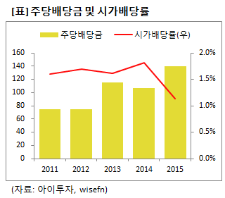 상아프론테크는 배당금을 꾸준히 지급했다. 최근 5년간 매년 주당 75~140원을 배당금으로 지급했으며, 이 기간 동안 시가배당률은 1.1~1.8%다. 올해 2월 발표한 현금배당 결정공시에 따르면 2015년 보통주 주당 배당금은 140원으로 전년보다 33원 늘었으나, 주가가 하락해 시가배당률은 0.7%p 하락한 1.1%를 기록했다. 올해도 140원을 지급한다면, 현재 주가 기준 시가배당률은 전년보다 0.1%p 내린 1.0%다.