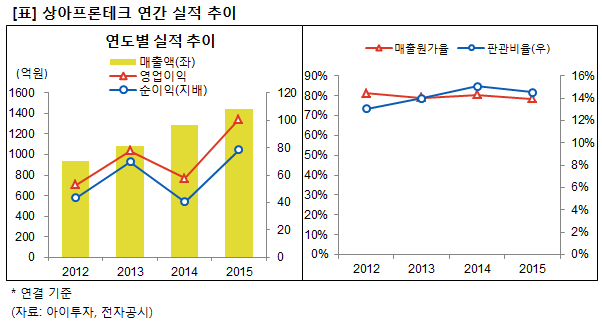 이런 가운데 상아프론테크의 매출액은 2012년 이후 매년 증가했다. 지난해 매출액과 영업이익은 각각 전년 대비 12%, 74% 늘어난 1437억원, 101억원을 기록했다. 순이익은 94% 증가한 79억원이다.