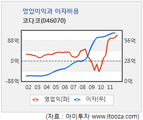 이 회사는 지난해 매출액이 2010년 대비 26% 증가한 1869억원을 거뒀다. 영업이익은 26% 증가한 112억원, 순이익은 81% 증가한 18억7000만원을 기록했다. 국내외 완성차업체들의 판매량 증가로 실적이 개선됐다고 회사 측은 공시를 통해 밝혔다. 영업이익과 순이익의 차이가 큰 이유는 이자비용 때문이다. 코다코는 지난해 9월 말 기준 828억원의 차입금을 보유하고 있어 매년 66억원 가량의 이자비용이 발생한다.