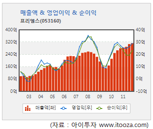 아이투자가 개발한 주식MRI로 분석한 프리엠스의 투자 매력도 종합 점수는 25점 만점에 19점으로 전체 상장기업 중 76위(상위 4%)를 차지했다. 중장기적으로 이익 성장률이 시장평균으로 중간성장형 기업에 속하며 재무 안전성은 높아 안전한 편이다. 또한 소비자 독점력이 보통으로 산업내 경쟁이 심화되면 수익성이 하락할 가능성이 있다.