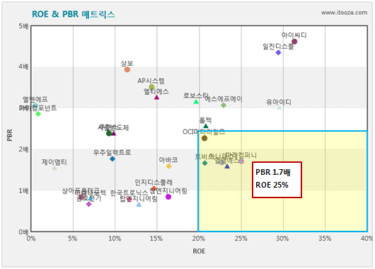 아이투자에서 개발한 ROE & PBR 매트릭스 차트에 따르면 미래컴퍼니는 디스플레이 업종 중에서 수익성이 높고 저평가돼 있는 종목으로 분류됐다.