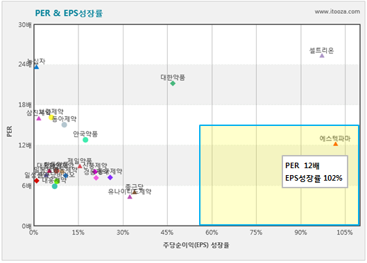 아이투자에서 개발한 PER & EPS 성장률 매트릭스에 따르면 에스텍파마는 상장된 제약업체 중에서 주가수익배수(PER)가 낮고 주당순이익(EPS) 성장률이 높은 종목으로 분류됐다. 에스텍파마는 차트의 오른쪽 하단인 4사분면에 위치해 있다. 이 영역은 상대적으로 PER은 낮고 EPS 성장률이 높은 기업이 해당한다. 이러한 기업은 투자매력도가 높다고 판단한다. 에스텍파마의 현재 PER은 12.1배, 3년간 연평균 EPS 성장률은 102%다.