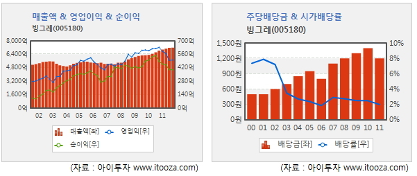 빙그레는 바나나맛 우유, 요플레, 끌레도르, 메로나 등으로 친숙한 기업이다. 유제품 매출이 56%, 아이스크림은 44%를 차지한다. 인지도 높은 브랜드를 보유하고 있어 안정적인 매출을 유지한다. 매년 배당도 하고 있다. 2003년 이후 매년 25% 내외의 배당성향을 유지하고 있다. 배당성향이 일정하고 순이익이 증가하면서 지급되는 배당금도 증가추세다. 지난해 주당 배당금은 1200원으로 시가배당률은 2%다.