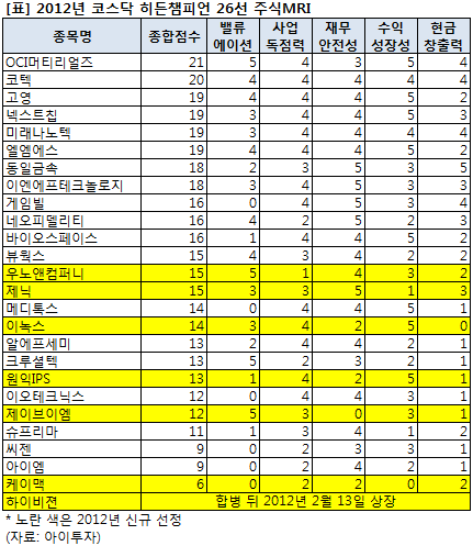 한국거래소는 지난 달 30일 '2012년 코스닥 히든챔피언' 26개사를 선정해 발표했습니다. 코스닥 히든챔피언 선정은 지난 2009년부터 시작됐는데요. 작년에 선정됐던 기업들의 주가가 지난 1년간 부진했다는 보도가 나오면서 히든챔피언에 대한 관심도 작년만 못한 듯 합니다. 2011년 코스닥 히든챔피언 37개 종목 가운데 23개 종목이 1년 전보다 주가가 하락했습니다.